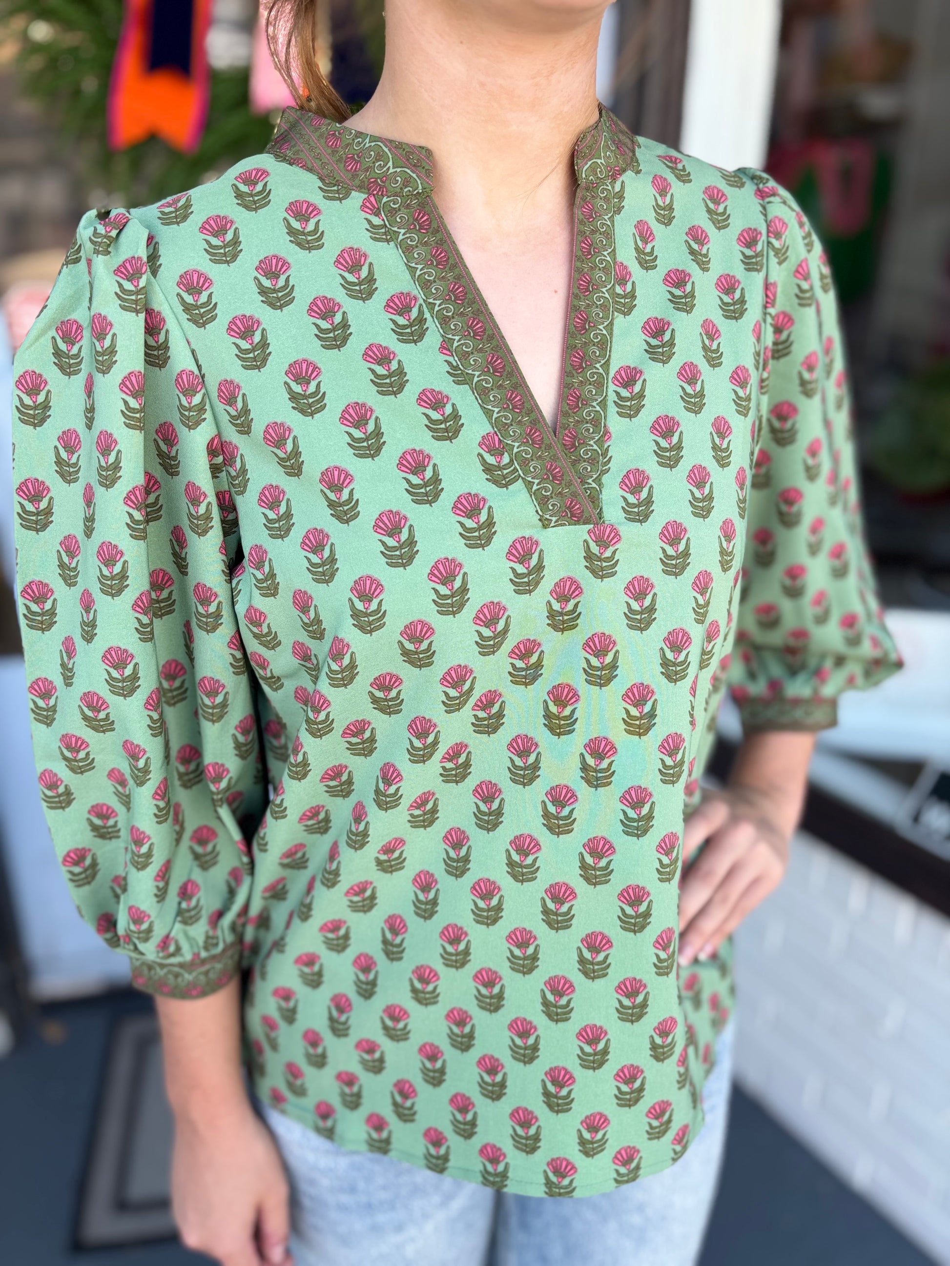 This olive & magenta colored blouse is beautiful for Fall! Pair with jeans for a casual look or dress it up with a pair of black pants!