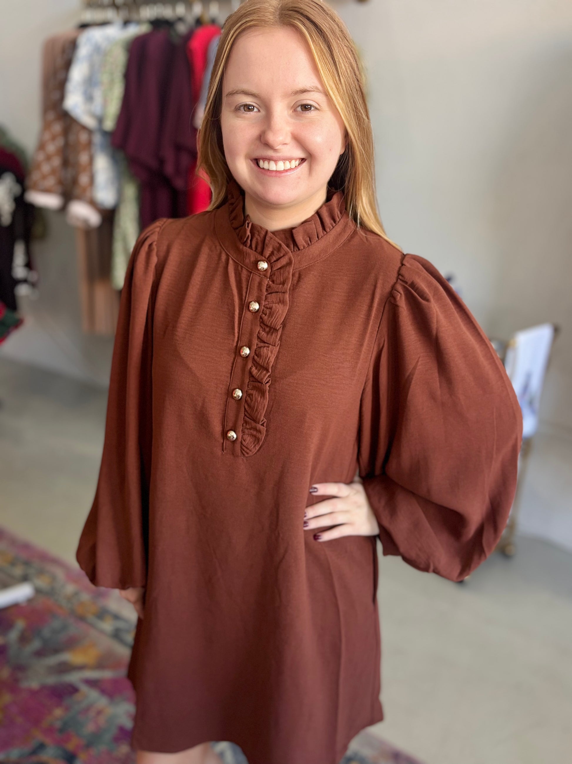 This beautiful brown colored dress is great for your next upcoming event! Pair with tights, knee high boots, or booties for a cute- dressy look! Features a ruffle collar with gold accent buttons and blouse sleeves!
