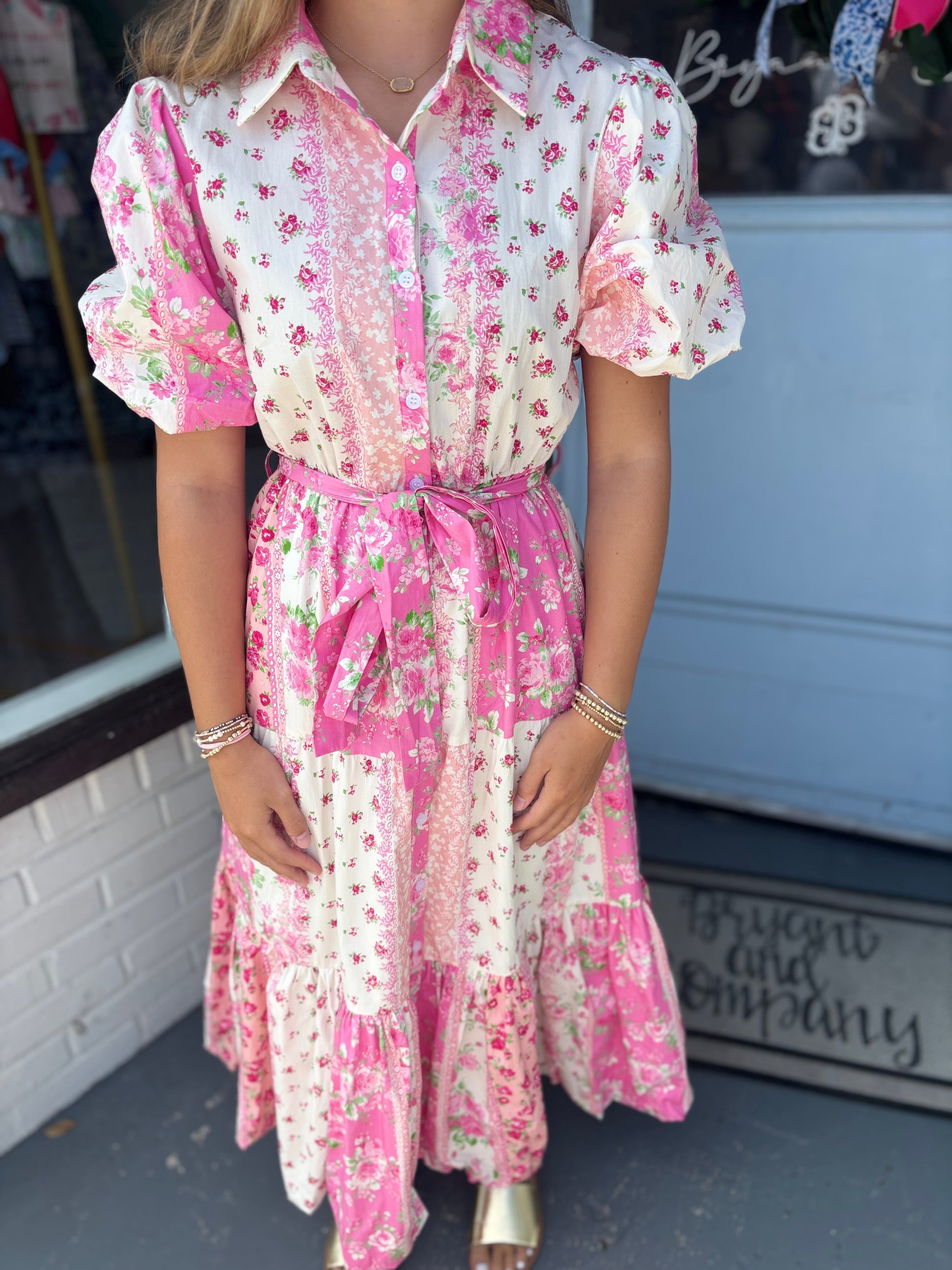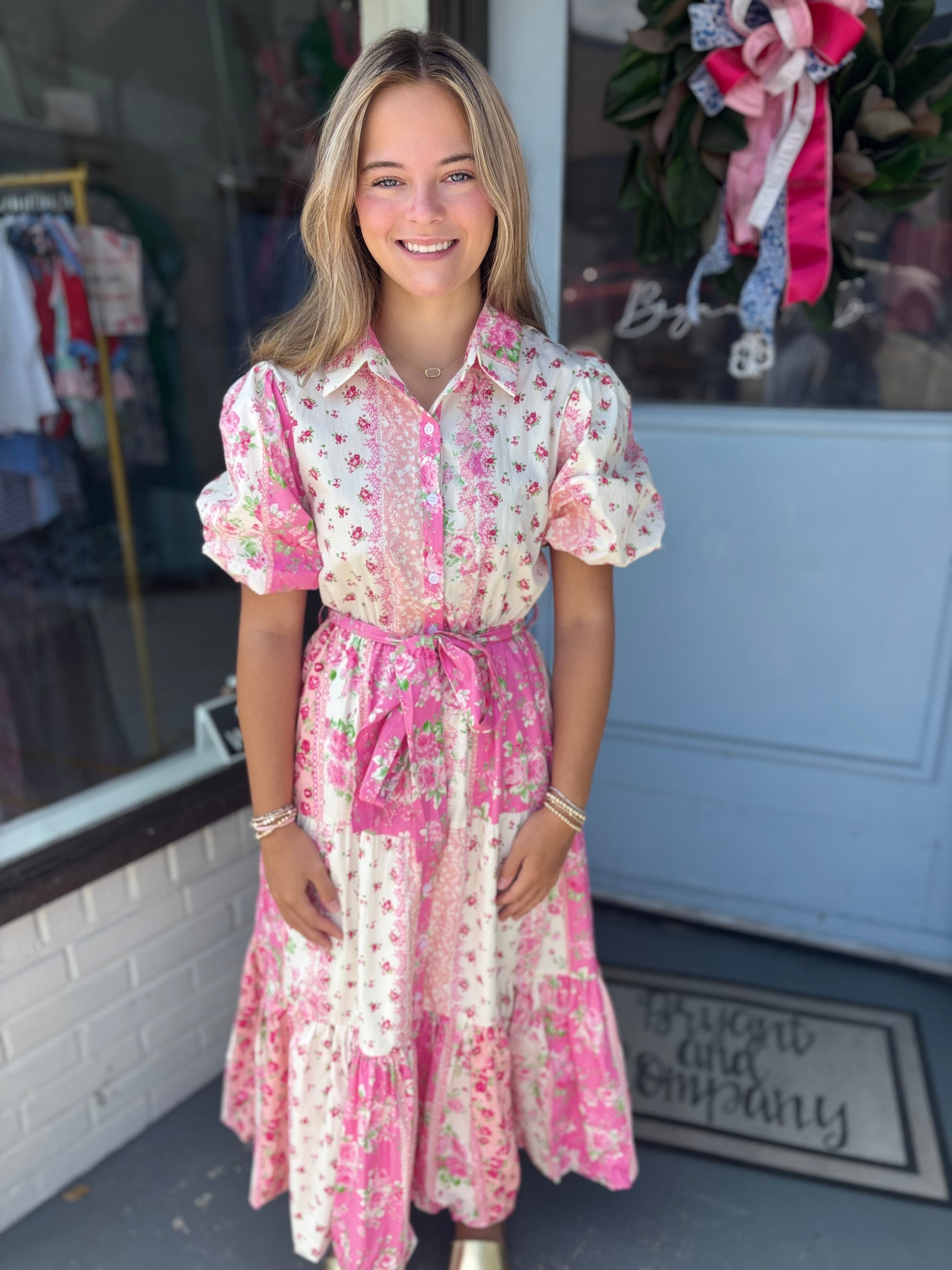 The prettiest dress! Self adjusting tie waist and button down closure with puff sleeves!