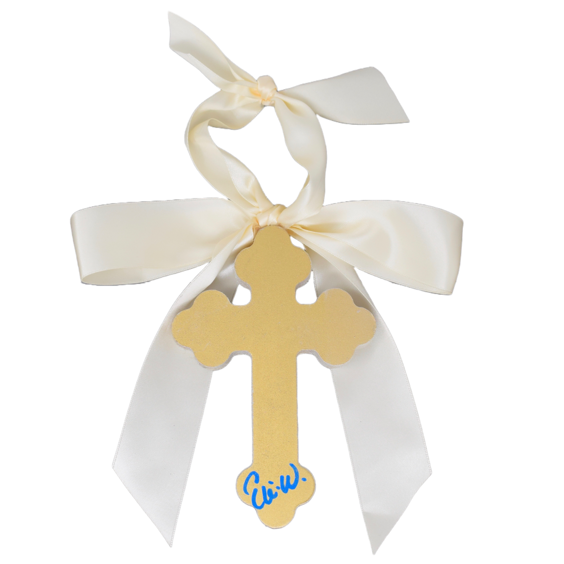 Each of our products are individually hand-painted, so what you receive may vary slightly in design. * Cross made of 3/4" thick MDF * 6" in length * Satin bow attached to the top * Back painted gold and signed by the artist