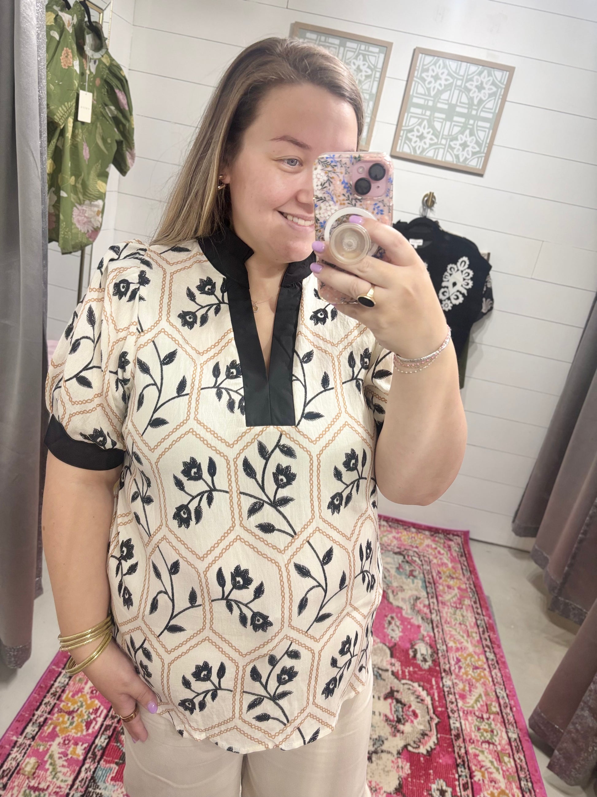 This lightweight, floral print, short sleeve top features a contrast pleated ruffle accent neckline! Beautiful for Fall!